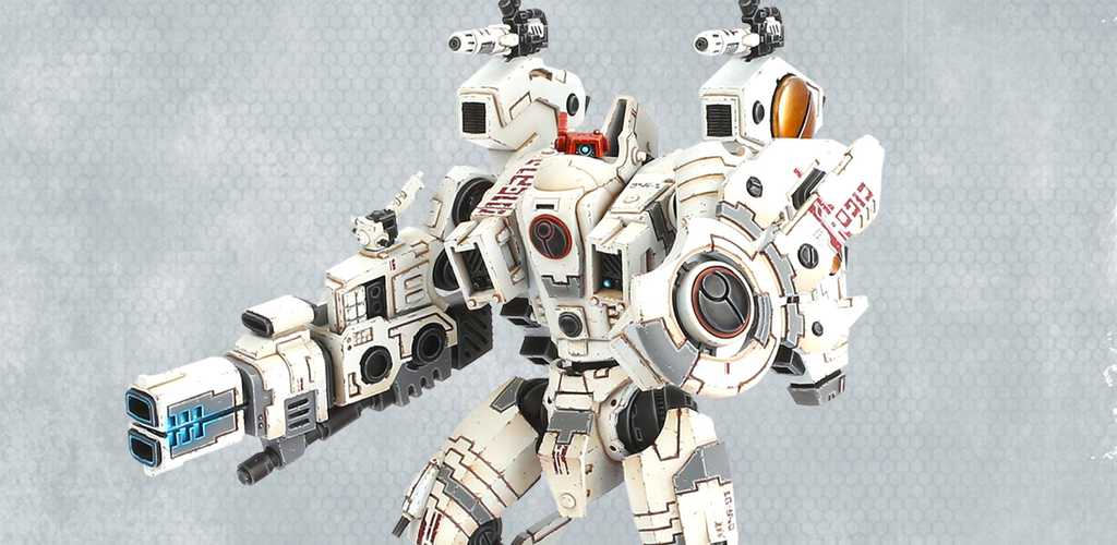 This model is equipped with: heavy burst cannon; twin plasma rifle; Riptide fists.