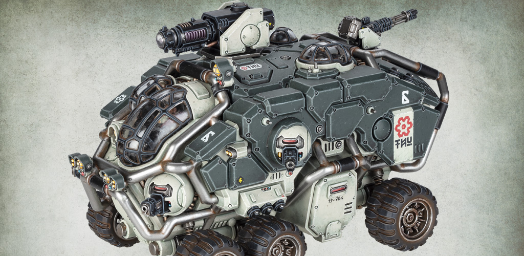 This model is equipped with: cyclic ion cannon; MATR autocannon; 2 twin bolt cannons; armoured wheels; pan spectral scanner.